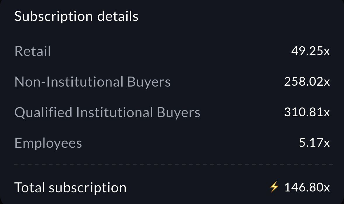 Investor appetite for the IPO was extraordinary. Overall subscription crossed 146×, with institutional demand exceeding 300×, supported by strong participation from non-institutional and retail investors as well. The book built steadily over the issue period, indicating conviction rather than last-minute frenzy.