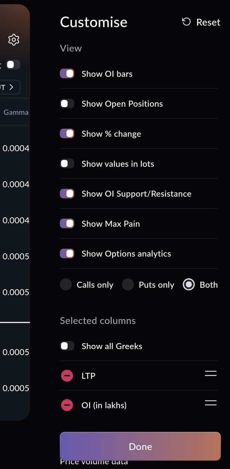 There are a range of options on the Sahi app that you can choose from to customise your option chain, specific to your needs.
